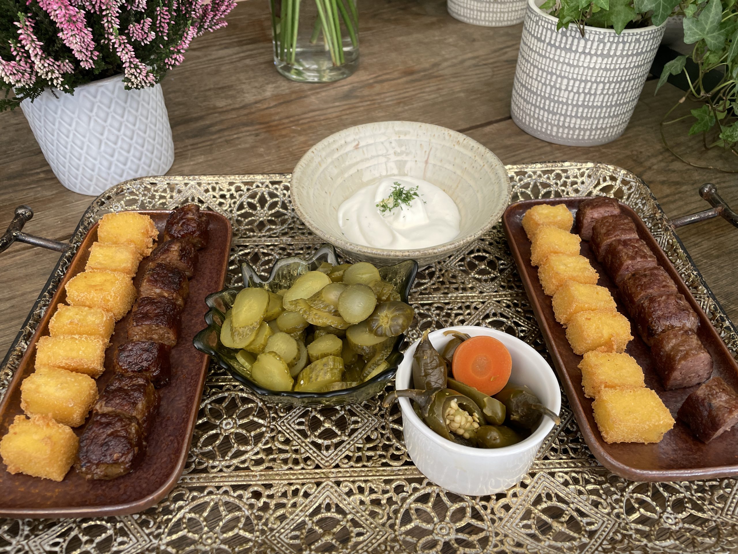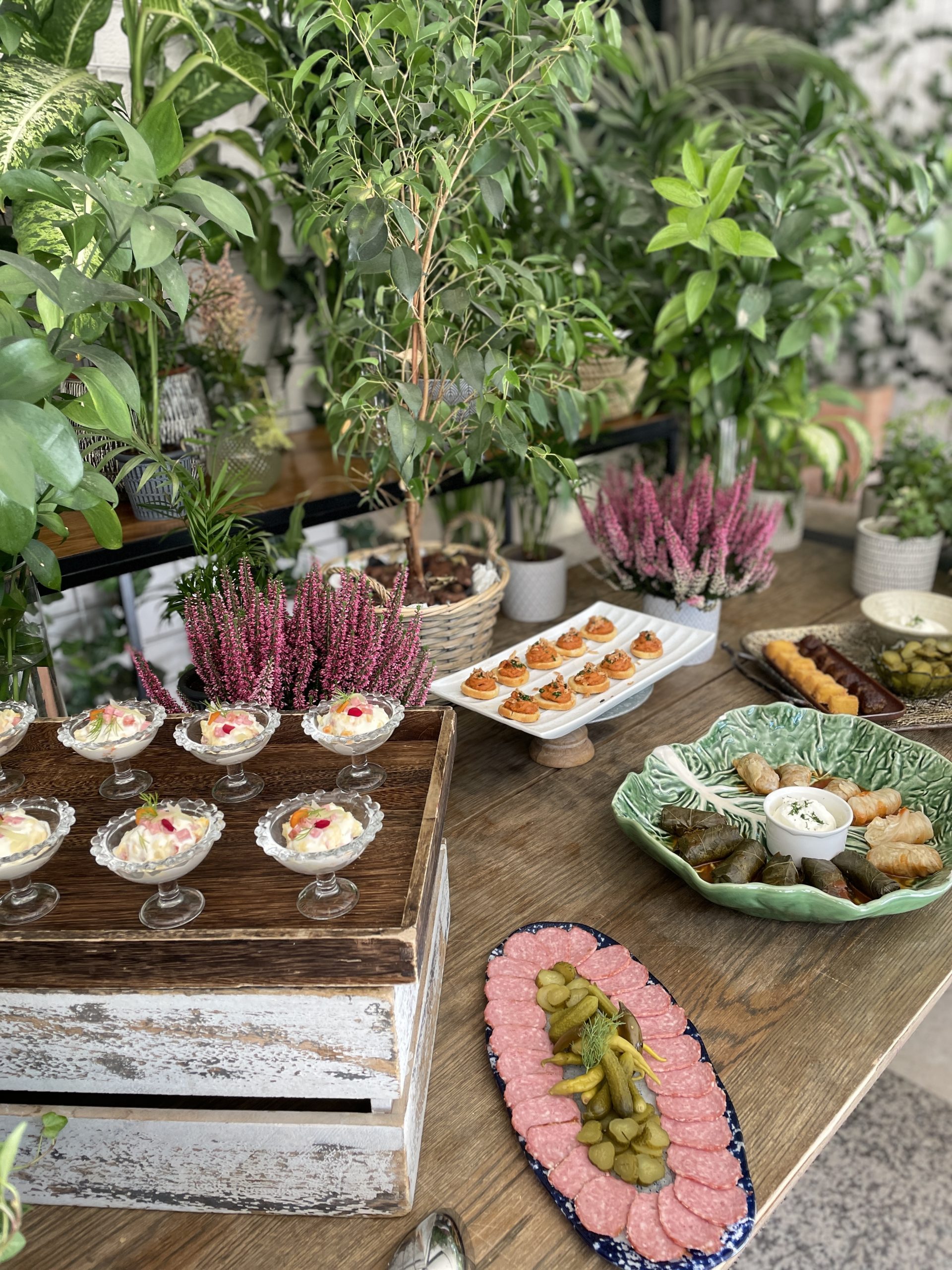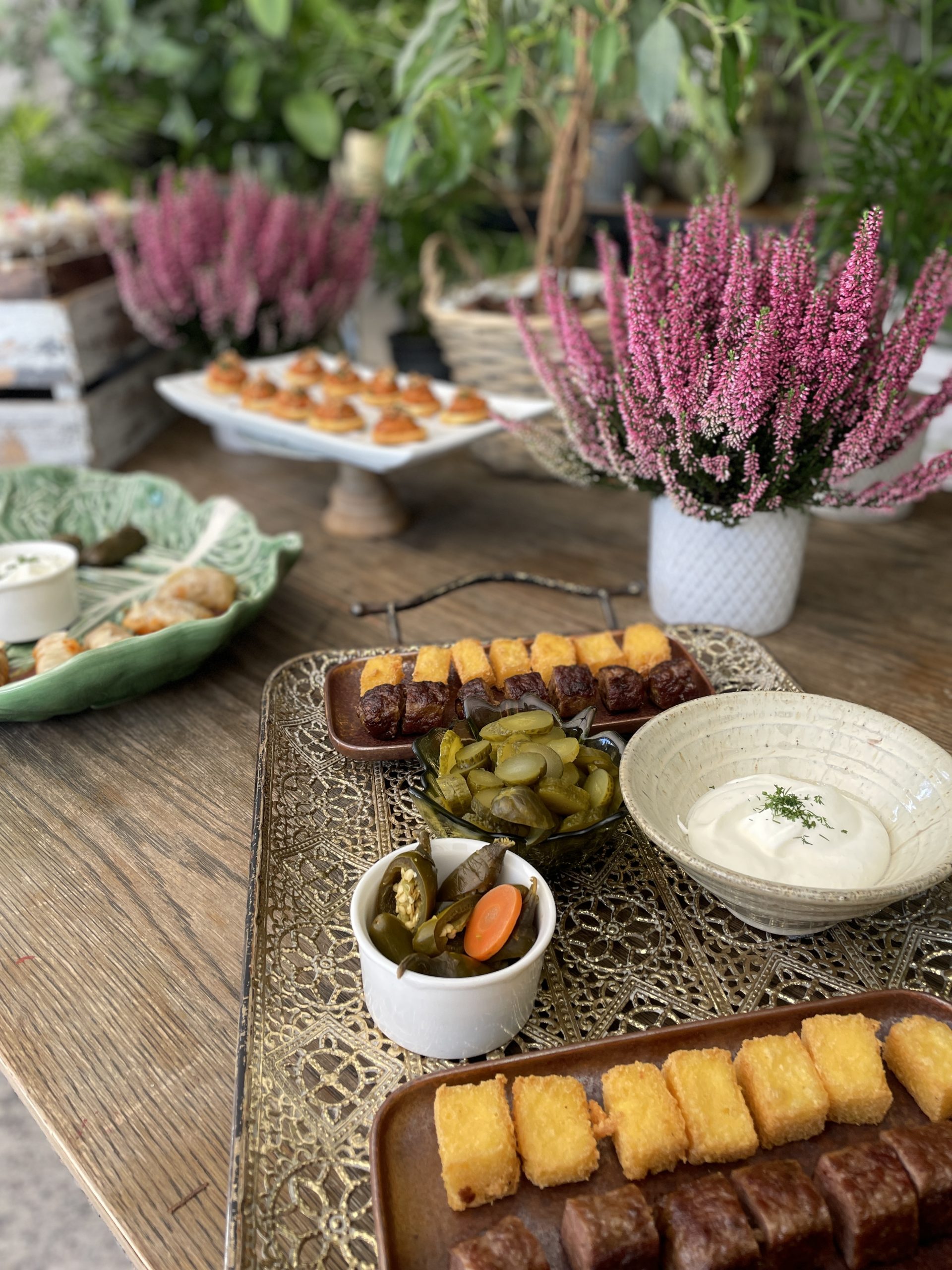 El espacio se llenó de vida con una cuidada presentación: mesas de madera decoradas con flores silvestres, vajilla artesanal y una atmósfera natural que invitaba a detenerse y disfrutar de cada detalle. Entre las opciones, aperitivos fríos y calientes que representaban la esencia de la gastronomía rumana —platos elaborados con mimo, herencia y un toque contemporáneo—.
