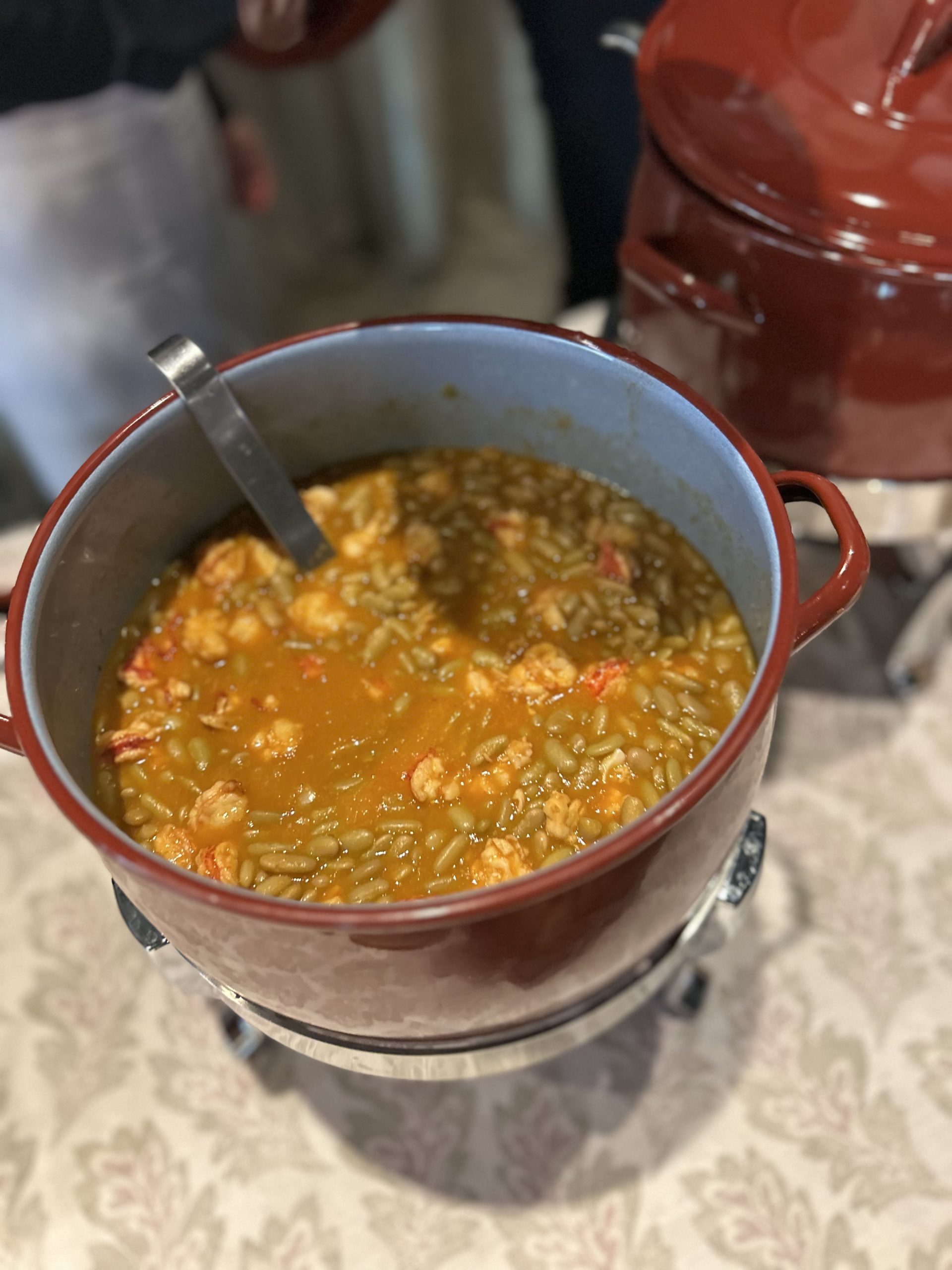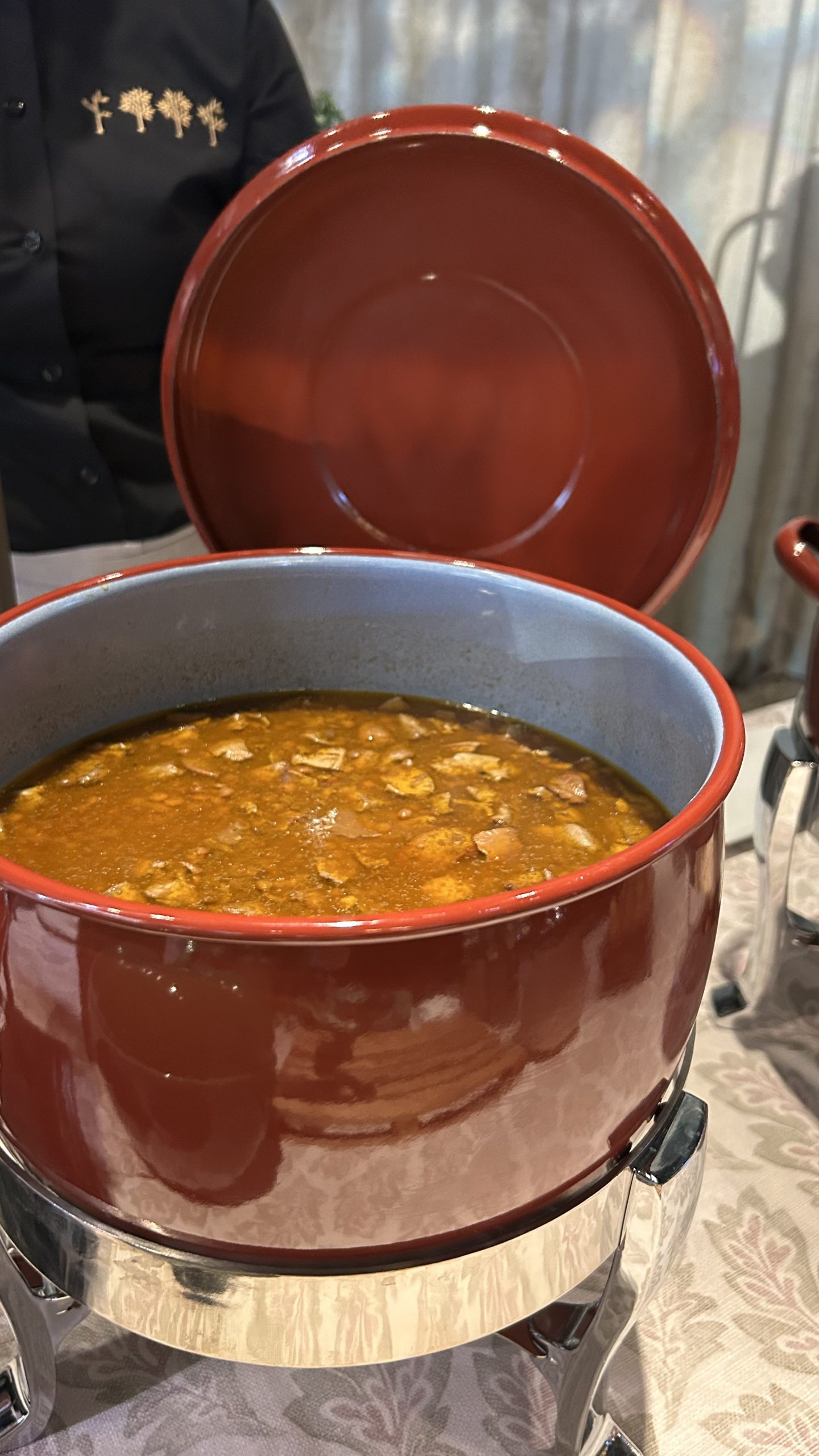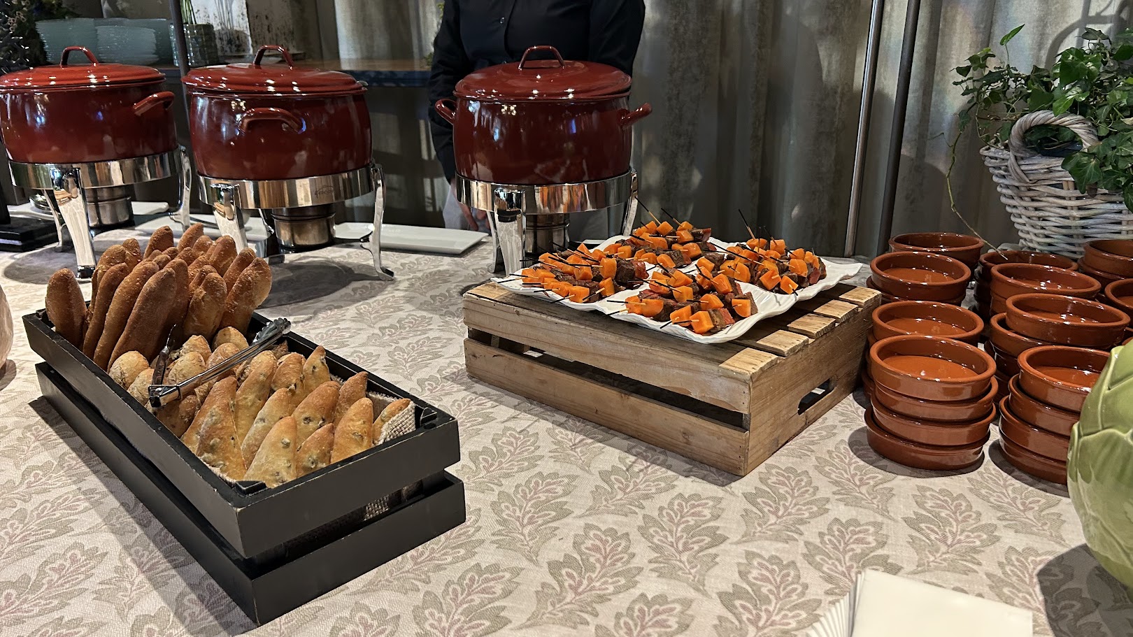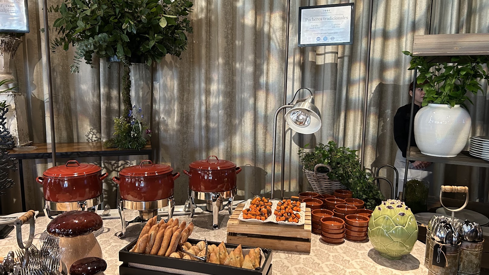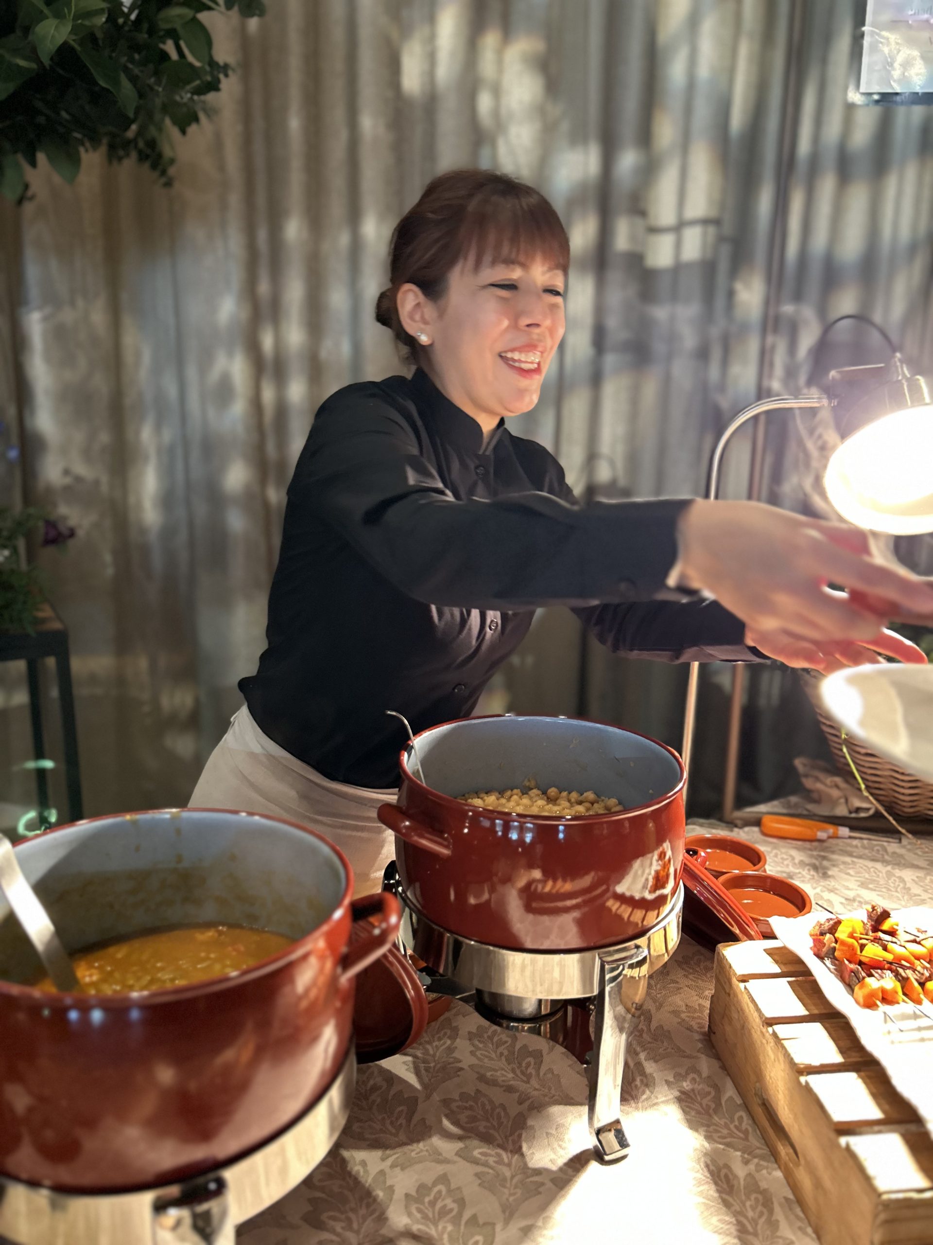 Sabemos que en un lugar para eventos de primer nivel, la experiencia visual es tan importante como el sabor. Por eso, cuidamos cada detalle del montaje. Imagina un rincón decorado con encanto, donde humean elegantes ollas tradicionales junto a pilas de clásicas cazuelitas de barro. Todo ello acompañado de una cuidada selección de panes artesanos y los acompañamientos perfectos (como nuestro original compango servido en brocheta) listos para degustar.