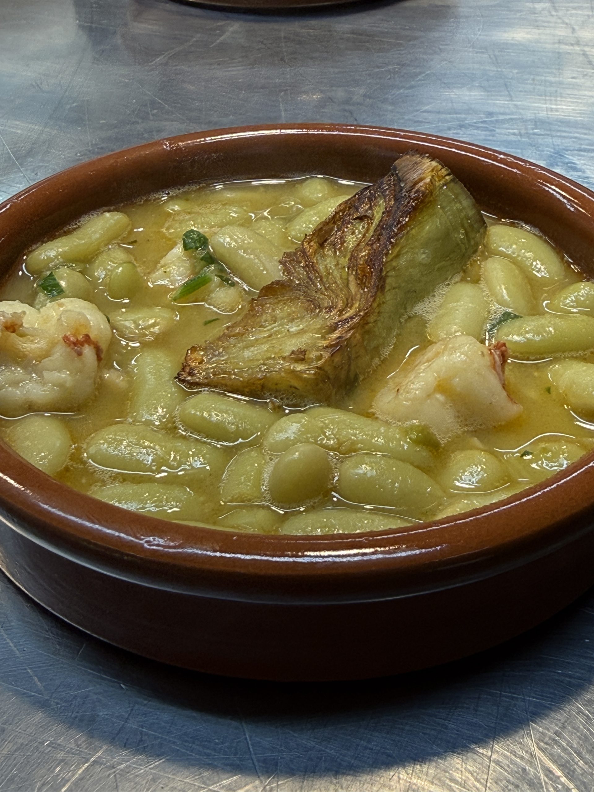 Verdinas con gambón y alcachofa