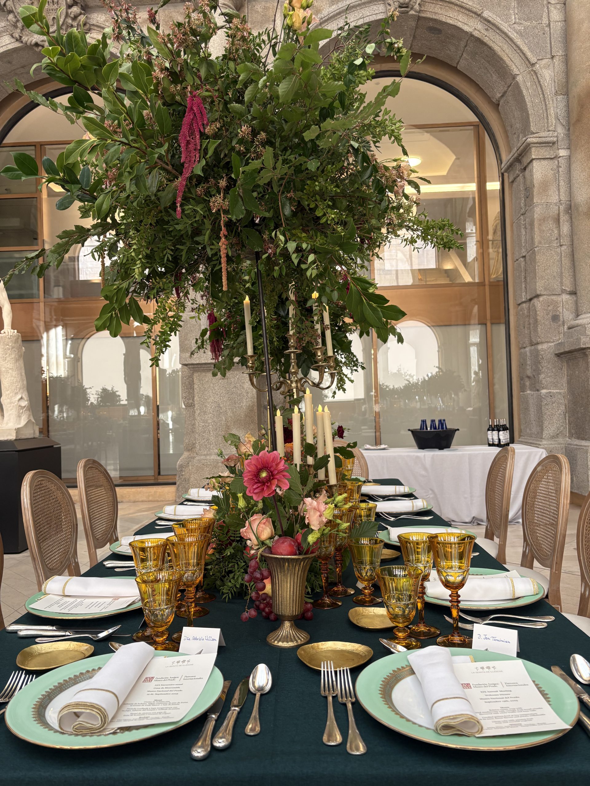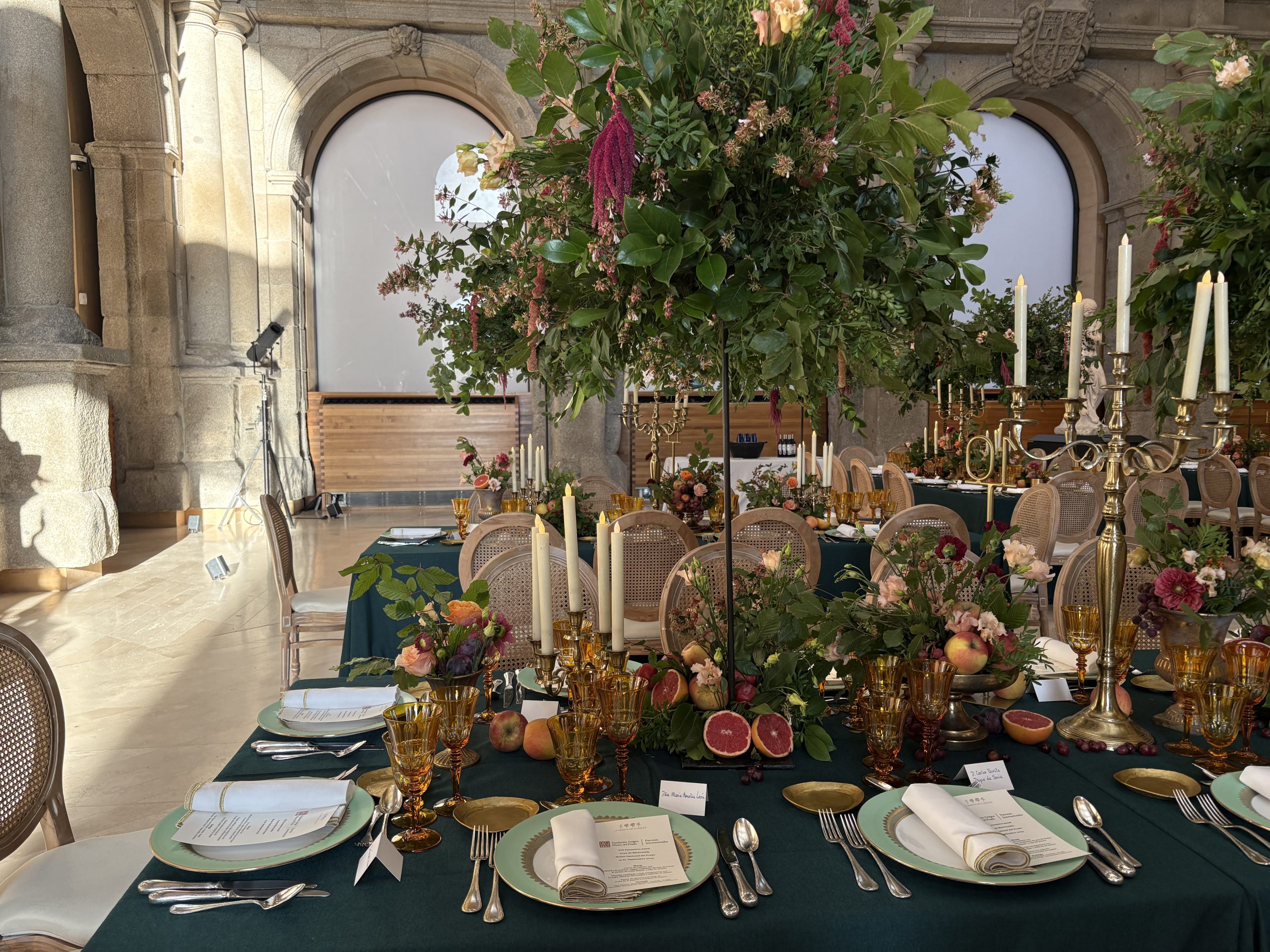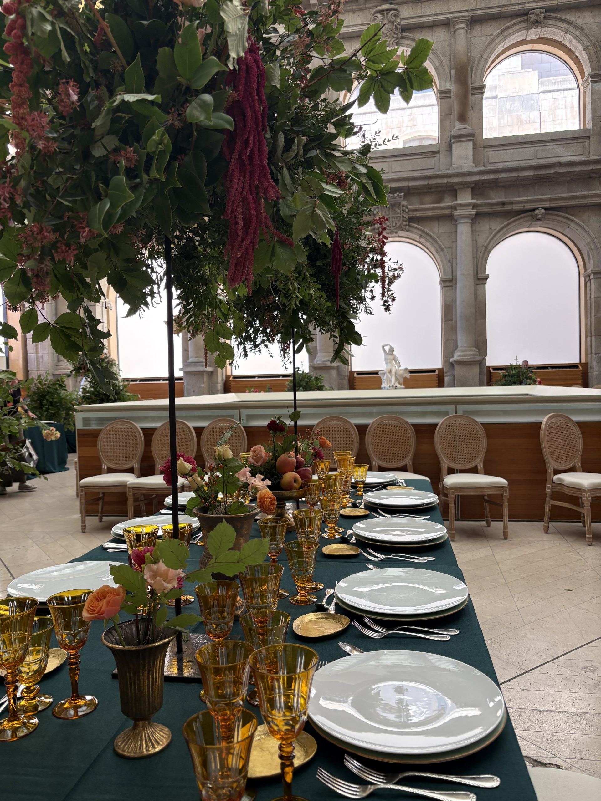 El majestuoso Claustro de los Jerónimos, con su arquitectura monumental y su espectacular techo acristalado, se transformó en un espacio donde gastronomía y belleza dialogaron en perfecta armonía. Las mesas, vestidas con manteles verde intenso, copas de cristal ámbar y centros florales de gran formato, crearon un ambiente sofisticado y vibrante. La calidez de las velas y los detalles con frutas frescas reforzaron la atmósfera acogedora, propia de un auténtico evento de lujo, de la mano del equipo y del catering de La Quinta de Illescas.